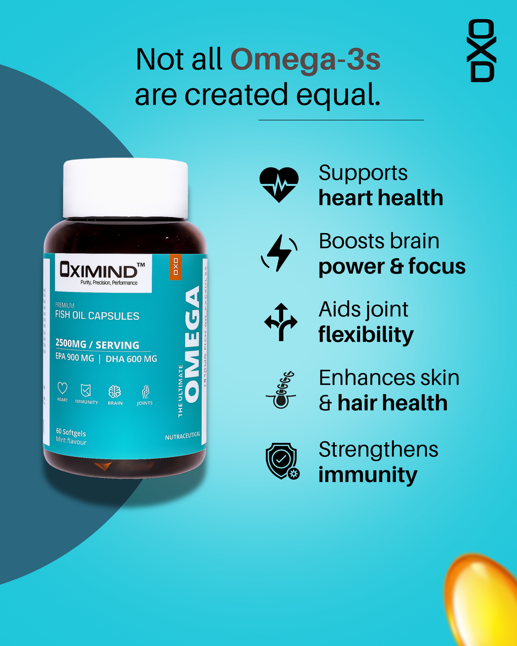 Oximind Ultimate Omega-3 Triple Strength capsules are designed to support your daily wellness journey. Made with pure DHA and EPA, our mint-flavored fish oil is lab-tested and produced in a USFDA-registered facility. Enjoy a refreshing supplement experience that fits seamlessly into your lifestyle.